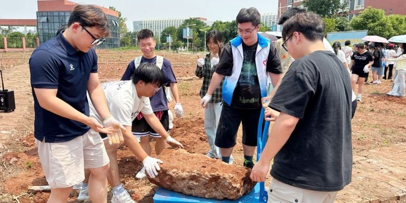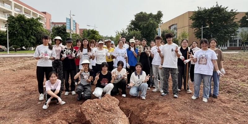 医学学院同学们分组协作,大家面对土地上的石块、杂物,或合力搬运或细致清理,展现出团结实干的精神。