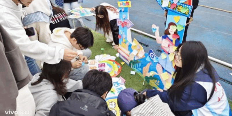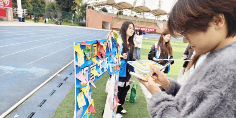 活动现场加油声与欢笑声此起彼伏。活动特别设置了“心理打卡乐无边”环节,将心理健康知识融入轻松有趣的互动中。同学们在“心理KT板”前写下近期的心情,并贴上展板,以拍照的方式记录灿烂笑容,传递积极情绪,实现心灵的“充电”。