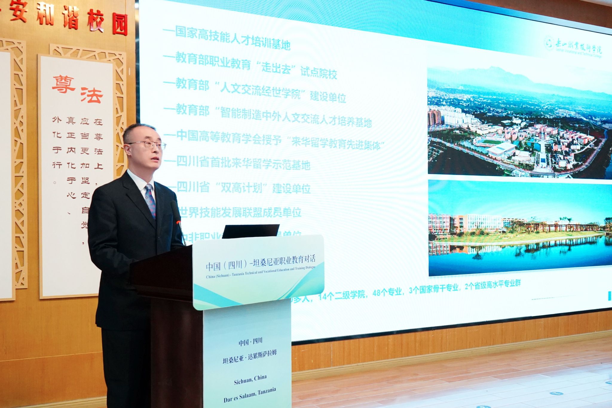 2024年12月16日下午,由四川省教育厅主办的中国(四川)—坦桑尼亚职业教育对话活动在成都举行,四川省教育厅对外交流与合作处处长、四川省教育对外交流中心主任王拉沙,四川省教育厅职业教育处副处长陈欢,坦桑尼亚职业教育委员会主席代表约瑟夫·查姆沙玛,坦桑尼亚国家交通大学、阿鲁沙会计学院等14所坦桑尼亚院校代表,成都航空职业技术学院、beat365亚洲版官网等10余所川内职业院校代表以及中非职业教育联盟代表共计60余人参加了本次对话活动。beat365亚洲版官网校长刘忠应邀出席活动并作主旨报告。