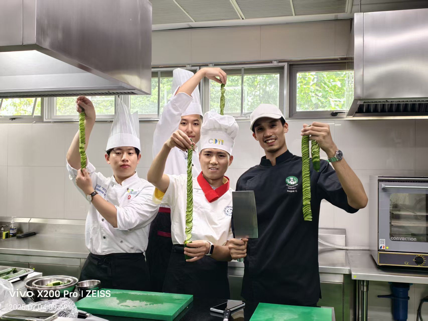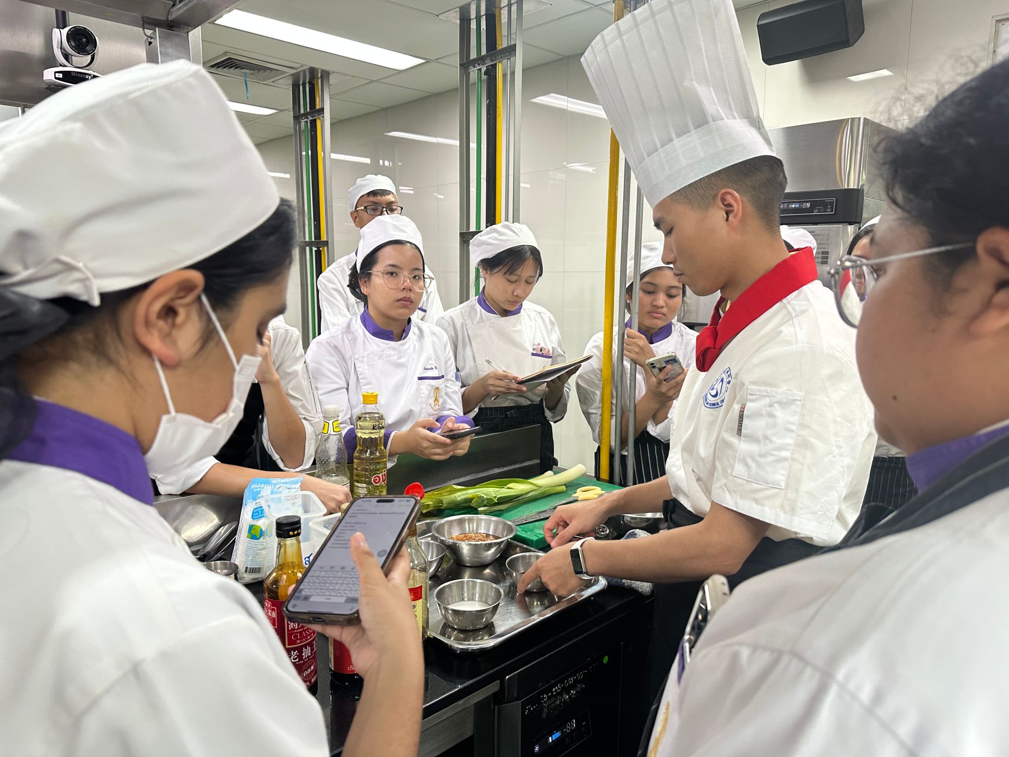 尤为引人注目的是 “蓑衣黄瓜” 刀工绝技展示:黄瓜在廖老师手中化作薄如蝉翼的连环片,展开长达1.2米却不断裂,泰国烹饪系主任高锦里教授惊叹:“这不仅是厨艺,更是东方美学的具象化呈现!” 现场 20 余名泰国学生分组实操,热情高涨。