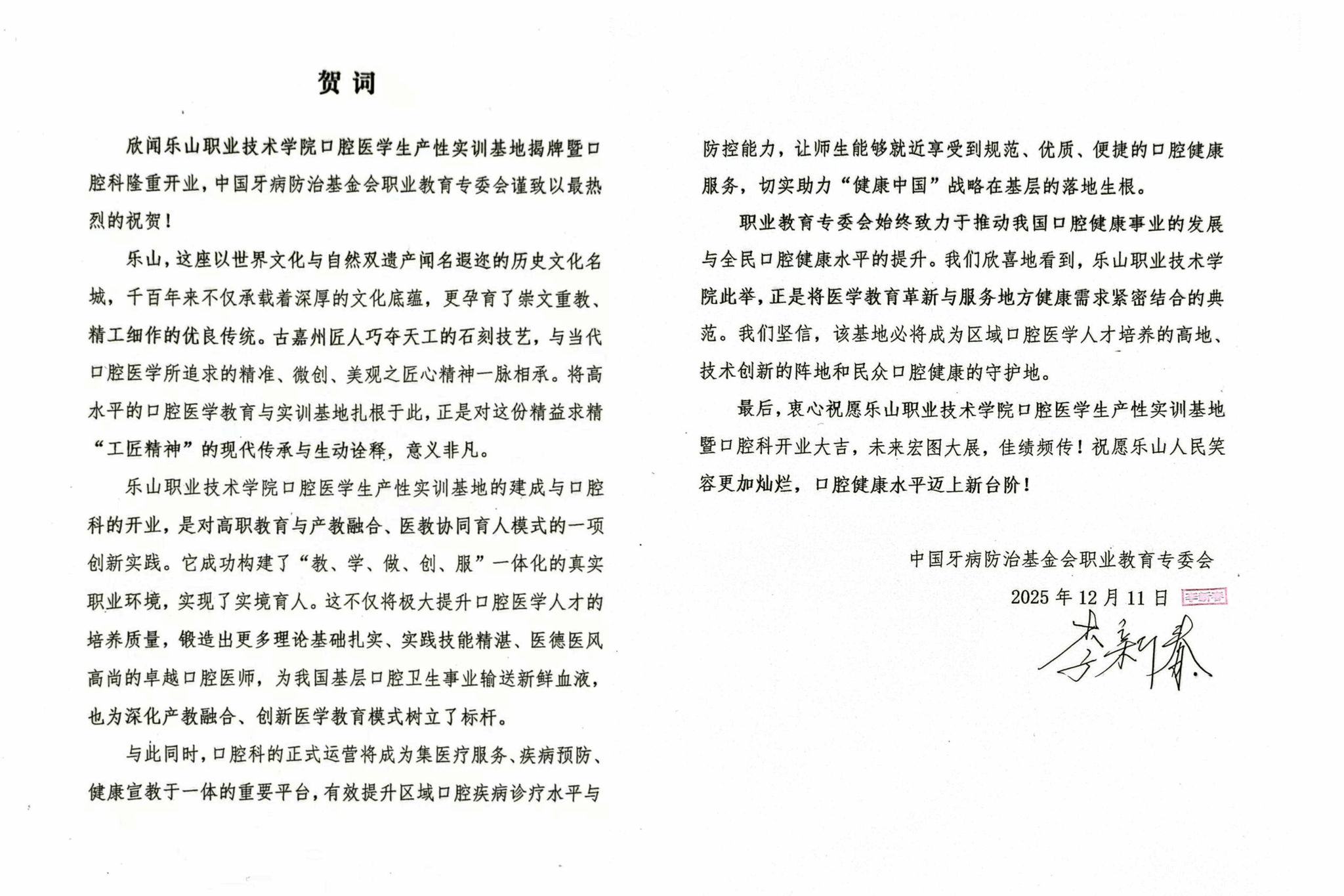 仪式开始,在实训基地一楼大门口举行的揭牌环节中,学校党委副书记、工会主席张佳首先宣读了学校《关于同意口腔医学生产性实训基地运行暨口腔科开业的通知》。随后,学校校长刘忠代为宣读中国牙病防治基金会口腔医学职业教育委员会贺词。贺词中高度肯定了此次实训基地与口腔科建设的意义,称其是高职教育产教融合、医教协同育人模式的创新实践,既传承了精益求精的“工匠精神”,又为基层口腔卫生事业注入新活力。宣读完毕后,校长刘忠与专家代表共同为实训基地揭牌,全体参会人员合影留念。