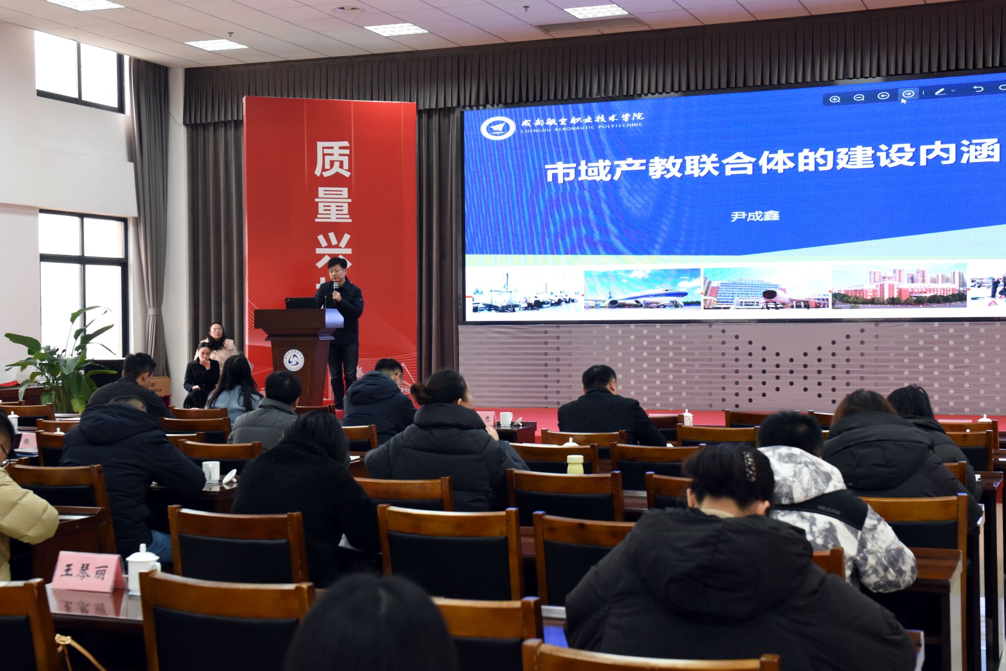 会议邀请了成都航空职业技术学院发展规划处处长尹成鑫、乐山市数智创新研究院院长颜亮锋、和光同程光伏科技有限公司研发部部长袁正国作专题报告,他们分别从学校、科研机构、企业三个角度分享了推进市域产教联合体的思考建议。