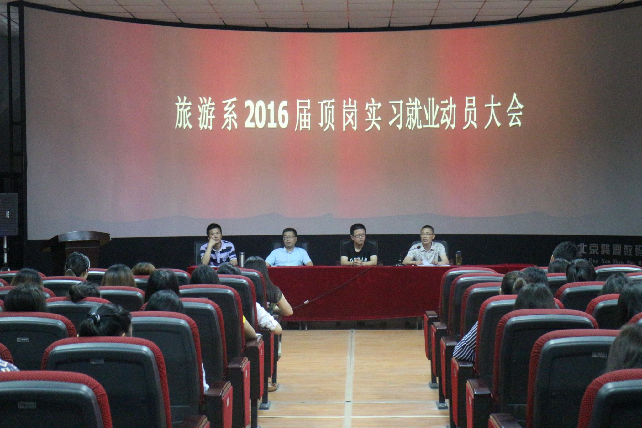 为了提高学生实习就业积极性,6月3日下午三点,旅游系在3D实训室举办了2016届毕业生就业的动员大会。本次动员大会的总动员老师有招办处老师,系党总支书记李忠东,系副主任何加健,以及系副主任黄剑波。