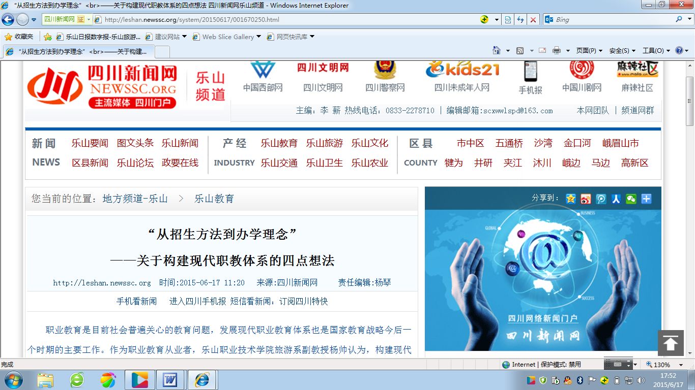 2015年6月17日,乐山《三江都市报》数字报和四川新闻网乐山频道全文转载了我院旅游系教师杨帅关于构建乐山现代职业教育体系的文章。该文章认为,职业教育是目前社会普遍关心的教育问题,发展现代职业教育体系也是国家教育战略今后一个时期的主要工作。构建现代职教体系应该从招生方法、培养手段、资源平台和开放式办学等环节全方位推进。