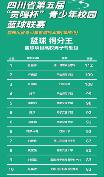 2025年5月7日至5月11日,由四川省教育厅、四川省体育局、共青团四川省委联合主办的四川省第五届“贡嘎杯”青少年校园篮球联赛(高校男子专业组)总决赛在宜宾学院(临港校区)落下帷幕。乐山职院男子篮球队由张宁、向亚君担任教练率队参加本次比赛,在本次比赛中表现出色,首次在省级比赛中战胜本科院校,队员罗磊在与成都外国语学院的比赛中凭借攻防两端的优异表现被评为“最具价值球员”,整个系列赛下来,队员刘佳昆在得分王榜单上以87分的总得分名列第七名,创造了学院体育赛事的新历史。这一成绩的取得,充分展示了乐山职院学子的拼搏精神和体育竞技实力。