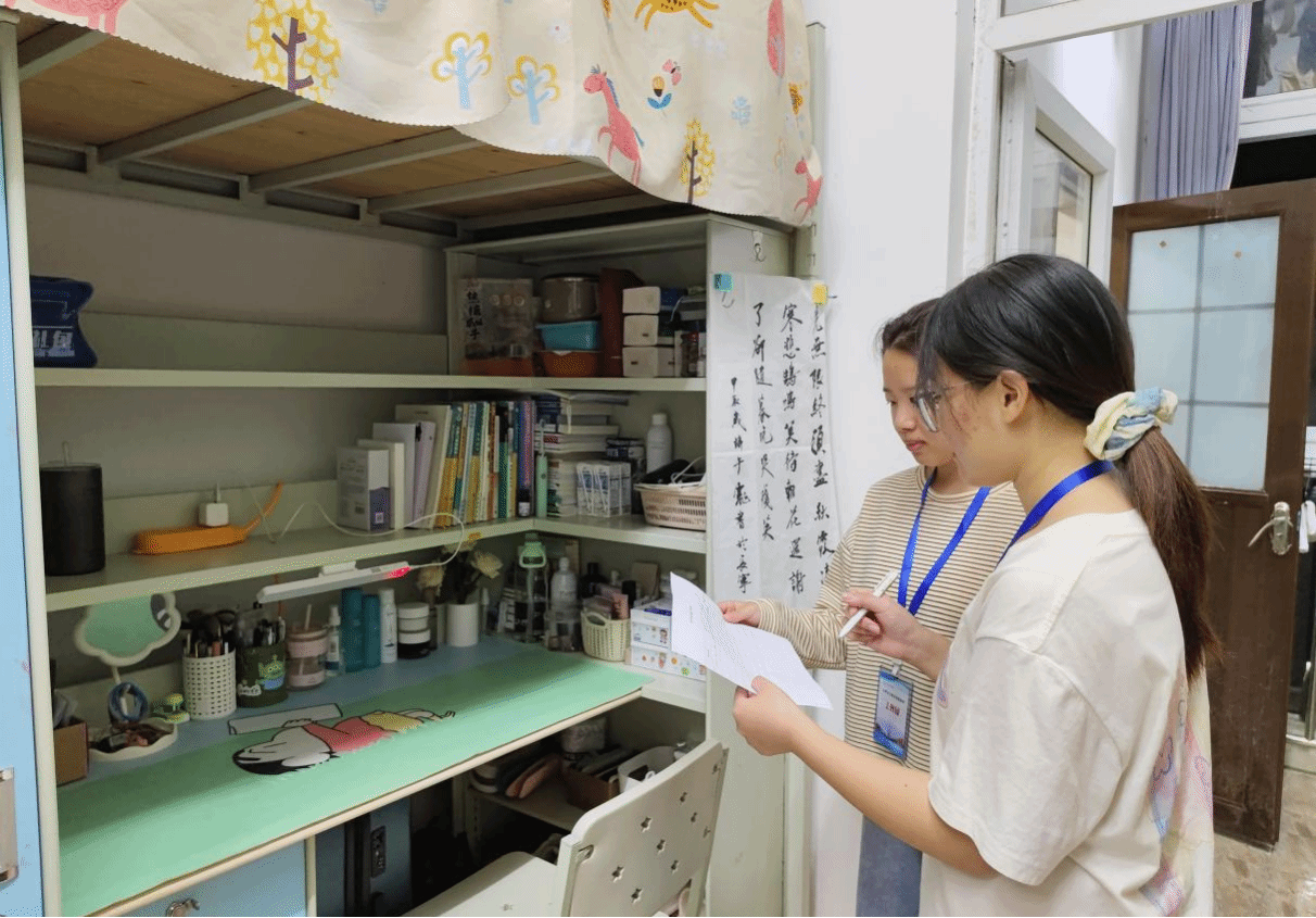 在评比过程中,公寓自律委员会成员严格遵守查寝礼仪,依照评分标准,从寝室卫生、物品摆放、内务整理、文化装饰设计等多个维度对学院各寝室进行了全面细致的检查。