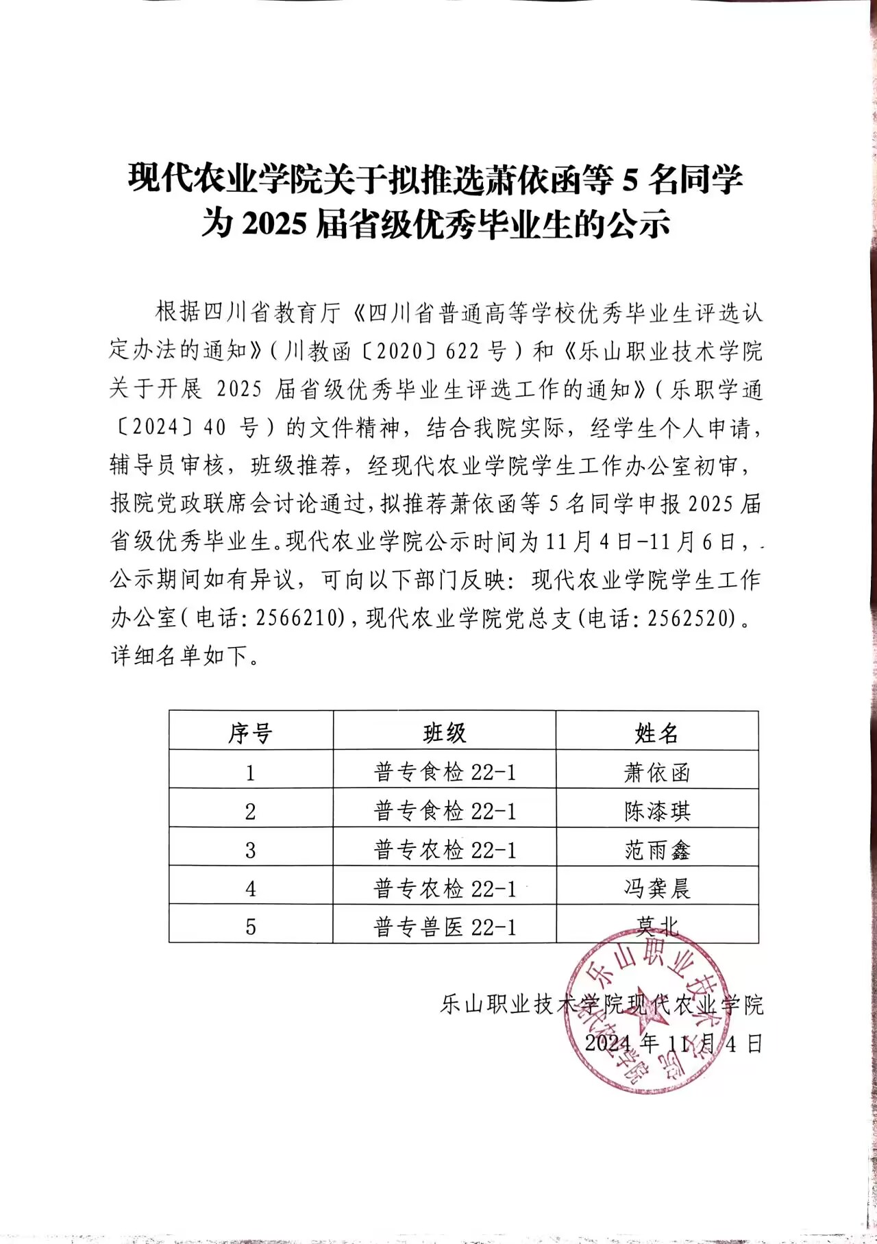 现代农业学院2025届省级优秀毕业生拟推荐名单公示