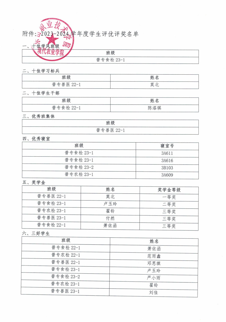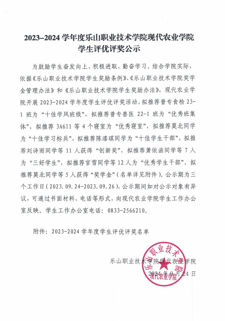 2023-2024学年度beat365亚洲版官网现代农业学院学生评优评奖公示