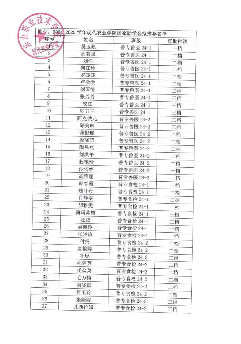 现代农业学院2024-2025学年度国家助学金拟推荐名单公示