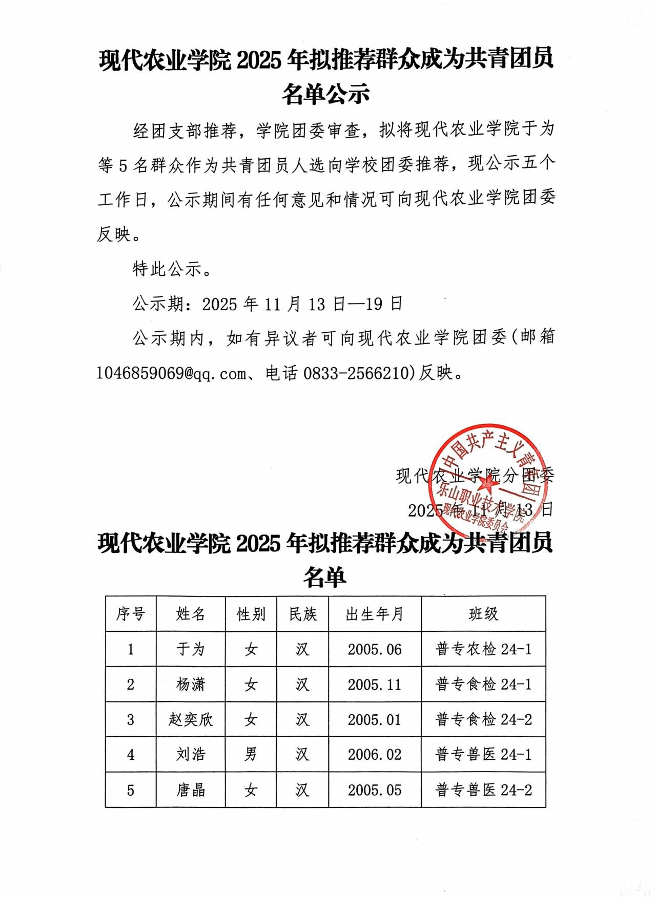 现代农业学院2025年拟推荐群众成为共青团员名单公示