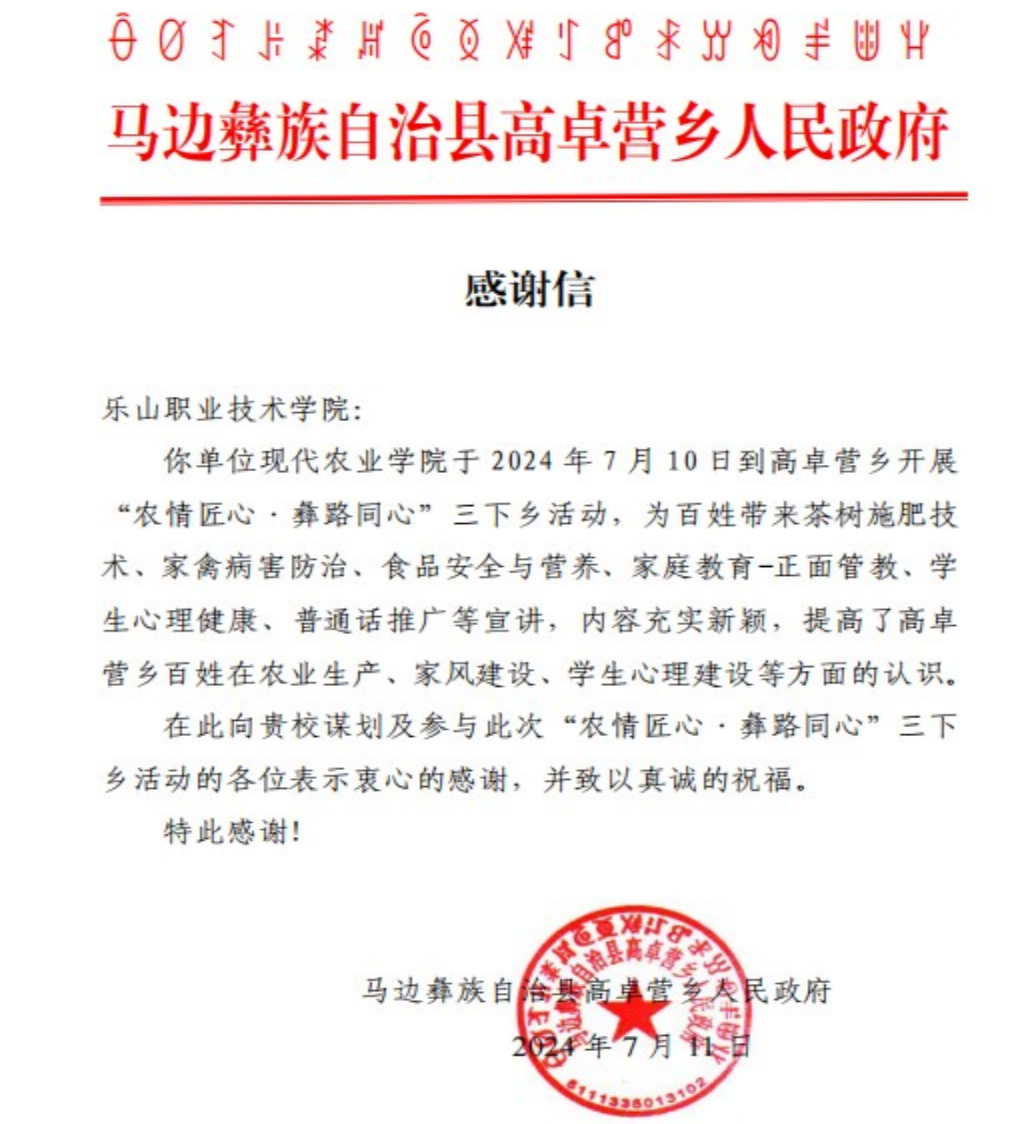 炎炎夏日,挡不住大家的热情。2024年7月10日,现代农业学院师生团队踏上了“三下乡”社会服务的征程,深入乐山马边彝族自治县烟峰镇和高卓营乡,开展了主题为“乡村振作兴‘彝’路同行”的社会服务活动。此次活动由党总支副书记宋建群带队,学生管理干事祝磊、分团委书记汤秀娟及谯雪琴等5名同学共同参与,旨在推进文化科技卫生“三下乡”,提升彝族地区的语言文字规范化水平,增强民族凝聚力,助力乡村振兴。 活动中,宋建群、祝磊老师为彝族同胞分享多年来从事学生工作的经验,提倡正面管教,同时提出关爱老人与引导孩子健康成长的方法和技巧,普及家庭教育、家风建设在孩子成长、社会进步中的重要性,引导村民解放思想,更新观念,提高素质。结合学院的专业特色,师生团队还为当地居民普及了食品安全、农业种植、畜牧养殖等专业知识,将理论知识与实际生产相结合,解答了居民在生产中遇到的问题,有效提升了当地的科技素养和生产水平。此外,师生团队还为彝族同胞发放了移风易俗生活用品,鼓励大家积极参与新彝寨建设,开启新生活。 师生团队的辛勤工作和专业讲解赢得了马边彝族自治县地方政府的高度评价,向学校发来感谢信。 活动结束后,师生团队纷纷表示收获颇多,巩固和加深了对现代农业知识的理解,全面提高了学生的综合素质,提升了师生社会服务能力,为能在推进移风易俗、建设文明乡风、提升少数民族精神文明建设水平等方面贡献青春力量感到骄傲和自豪。 图文/祝 磊 编辑/宋建群 审核/鲜凌瑾 2024年7月12日 |