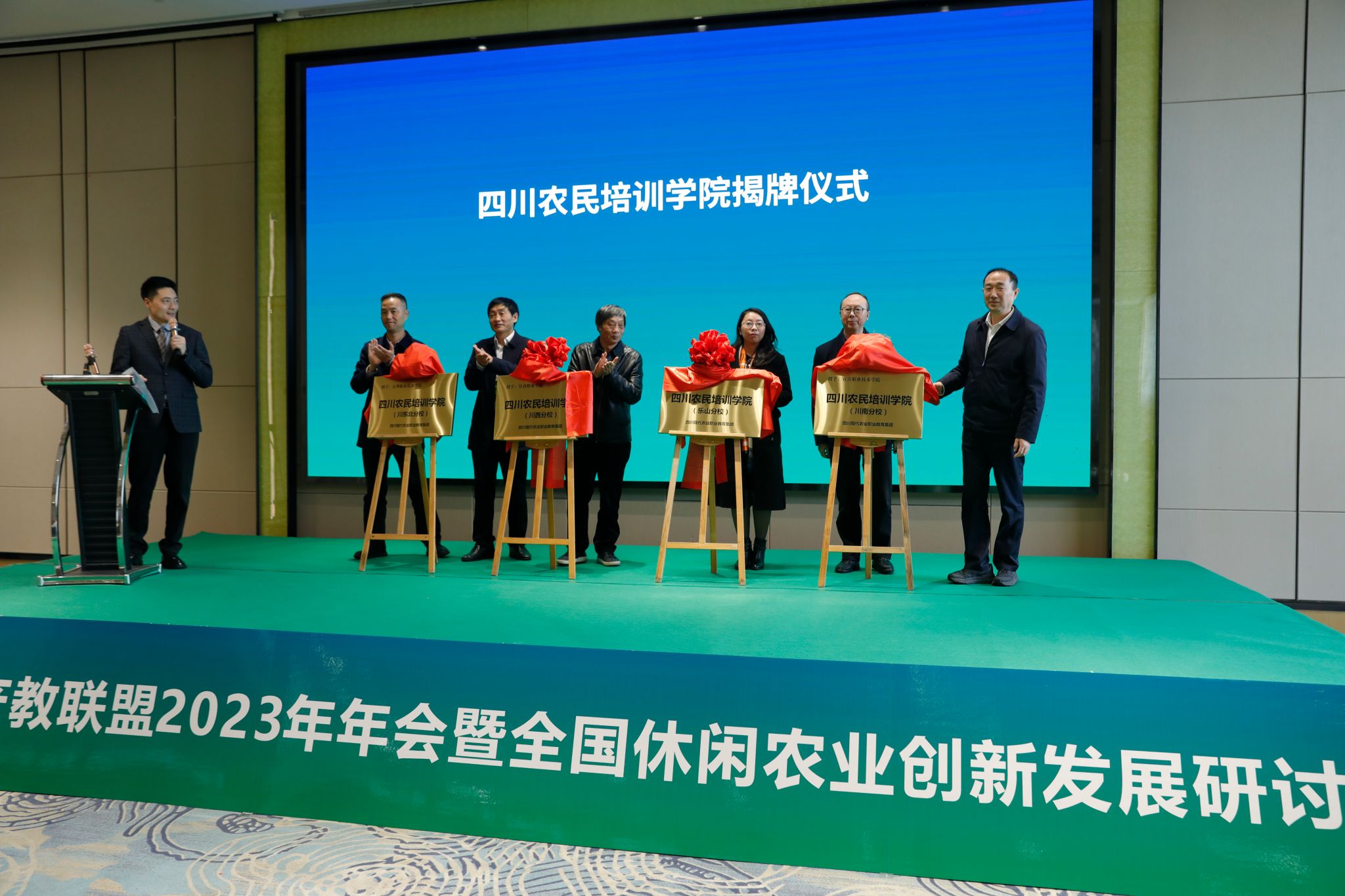 2023年12月6日,四川农民培训学院揭牌仪式在中国休闲农业产教联盟2023年会上举行。全国农村产业融合发展联盟、省农业农村厅相关领导出席会议,全国涉农相关院校、企业代表200余人参加了会议。学院党委委员、副校长周芹应邀为四川农民培训学院揭牌。据悉,四川农民培训学院是由成都农业科技职业学院发起,按照四川省“五区共兴”布局,由省内综合实力强,有农林牧渔类专业及师资队伍支撑,在农业农村农民培训中贡献多且经验丰富的单位联合组建而成的,致力于打造四川高素质高技能农民的社会培训基地和终生学习平台。联合体成员分别是位于成都平原的成都农业科技职业学院、川西南的beat365亚洲版官网、川南的宜宾职业技术学院、川东北的达州职业技术学院、川西高原的甘孜职业学院及深圳市天天学农网络科技有限公司。 下一步,学院将借助“四川农民培训学院”平台,坚决落实四川省委十二届二次全会提出“以‘四化同步、城乡融合、五区共兴’为总抓手,统揽四川现代化建设全局”的精神,充分发挥学院在推进四川乡村振兴、实现农业现代化中的作用,助力将“四川农业大省金字招牌擦得更亮”。