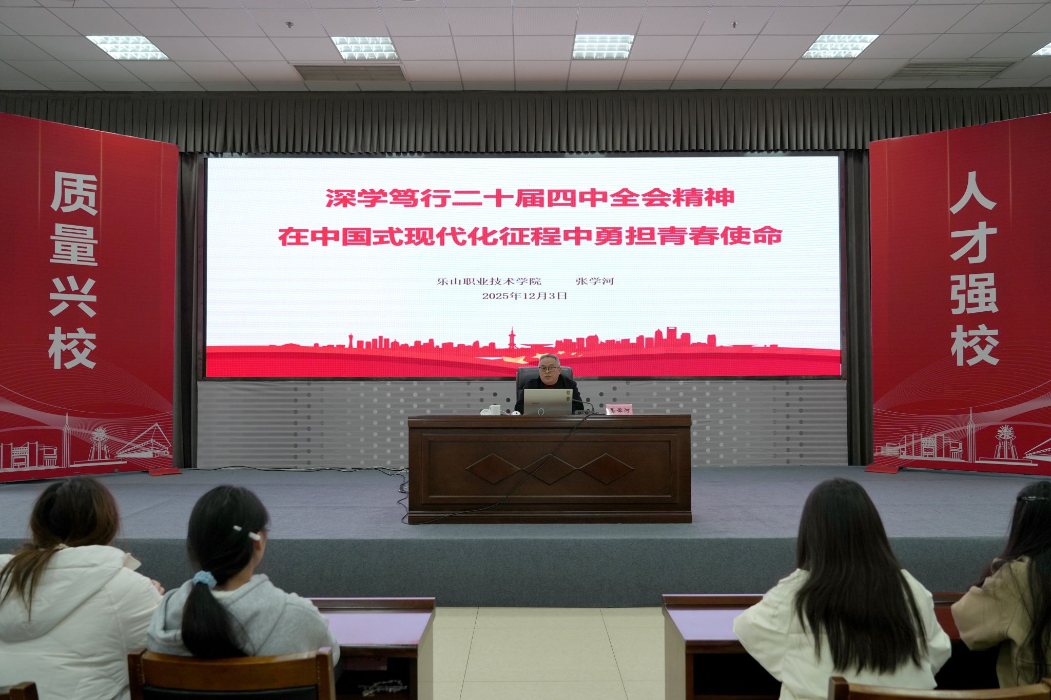仪式结束后,张学河以“深学笃行党的二十届四中全会精神在中国式现代化征程中勇担青春使命”为主题,聚焦党的二十届四中全会精神解读,结合国家“十五五”规划展望,并紧密联系职业教育发展实际与学校学生的具体典型案例,进行了深入浅出的讲解,为全体学员上了内涵丰富、指导性强的第一课。