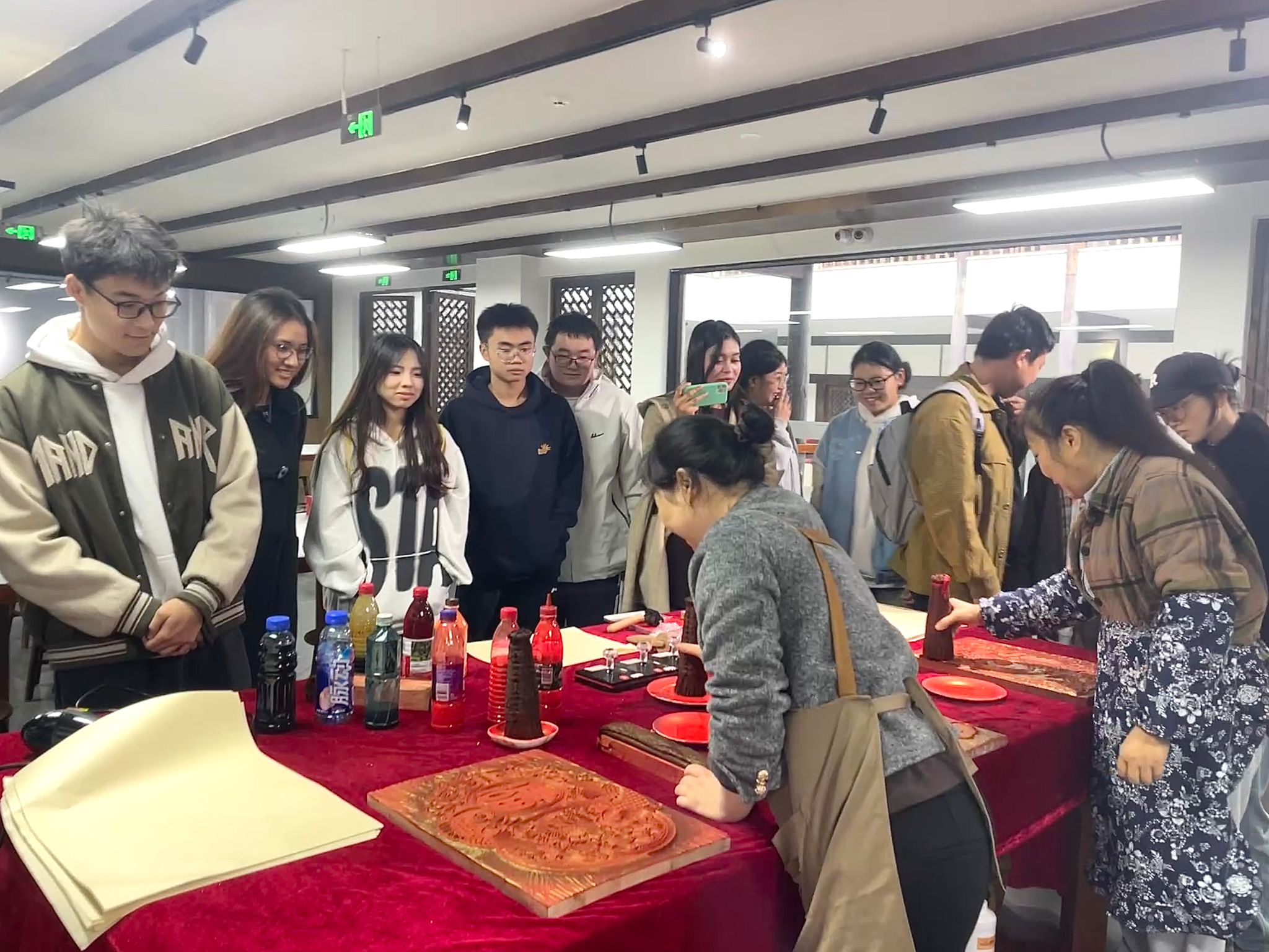 本次研学实践中最受期待的环节,当属年画动手印制体验。在国家级非物质文化遗产夹江年画代表性传承人张荣强老师的亲手示范与细致指导下,师生们积极参与,亲身感受年画印制工艺的独特魅力。从平整铺纸、均匀刷版到精准拓印,每一个操作步骤皆需细致耐心与技巧把控。