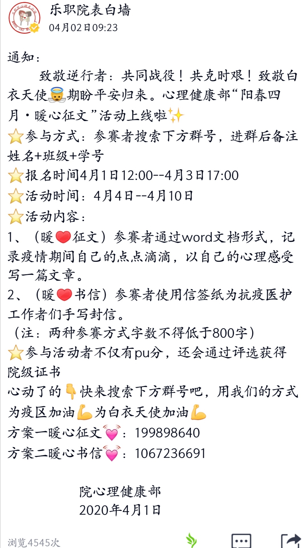 新冠病毒感染的肺炎疫情牵动着每个人的心,隔离病毒,绝不是隔离爱。抗击疫情,我们在一起。2020年4月1日—20日,院学生会心理健康部在线上举办“阳春四月•暖心征文”活动。