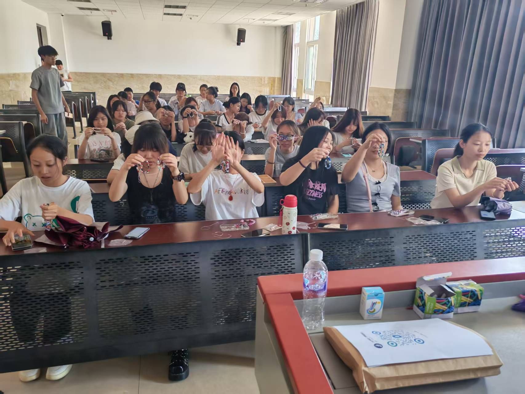 为弘扬中华传统手工艺文化,丰富校园文化生活,6月11日下午,beat365亚洲版官网朋辈心理辅导社在教学楼2C103成功举办"香韵光珠,巧手编织"主题活动。活动吸引了众多学生参与,现场气氛热烈,同学们在体验传统手工艺的过程中,既感受到文化魅力,又实现了心灵放松。