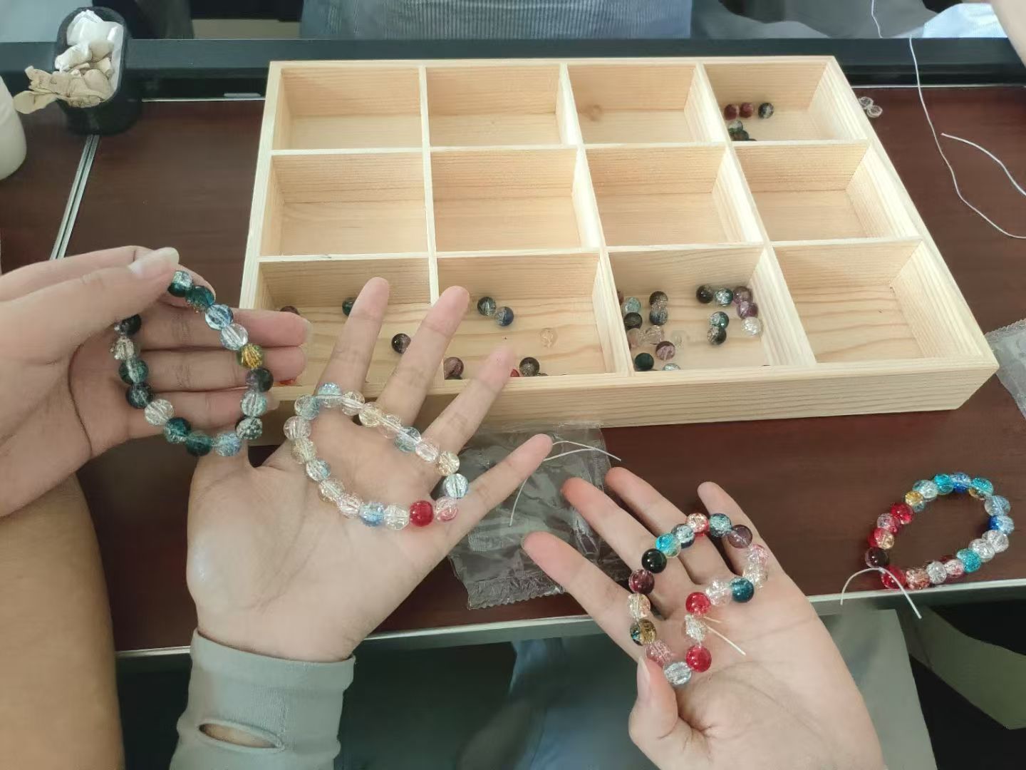 在自由组队环节,同学们充分发挥创造力,互相协作设计独具特色的香珠作品。彩珠在指尖流转,丝线交织成美丽图案,现场欢声笑语不断。这一过程既锻炼了动手能力,又增强了团队合作意识,让同学们在轻松氛围中释放学业压力,享受创作乐趣。