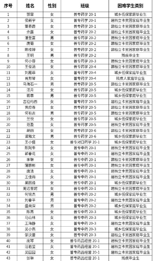 生物医药学院2023年高校困难毕业生就业帮扶经费拟发放名单