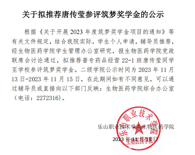 下一条: 生物医药学院关于拟推选杨芮等13名同学为2024届省优毕业生的公示