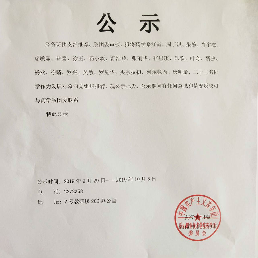 药学系2019年团内推优人员名单公示