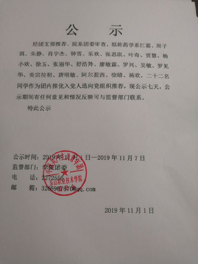 团内推优入党人选公示