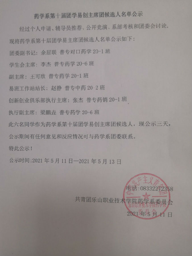 药学系第十届团学易创主席团候选人名单公示