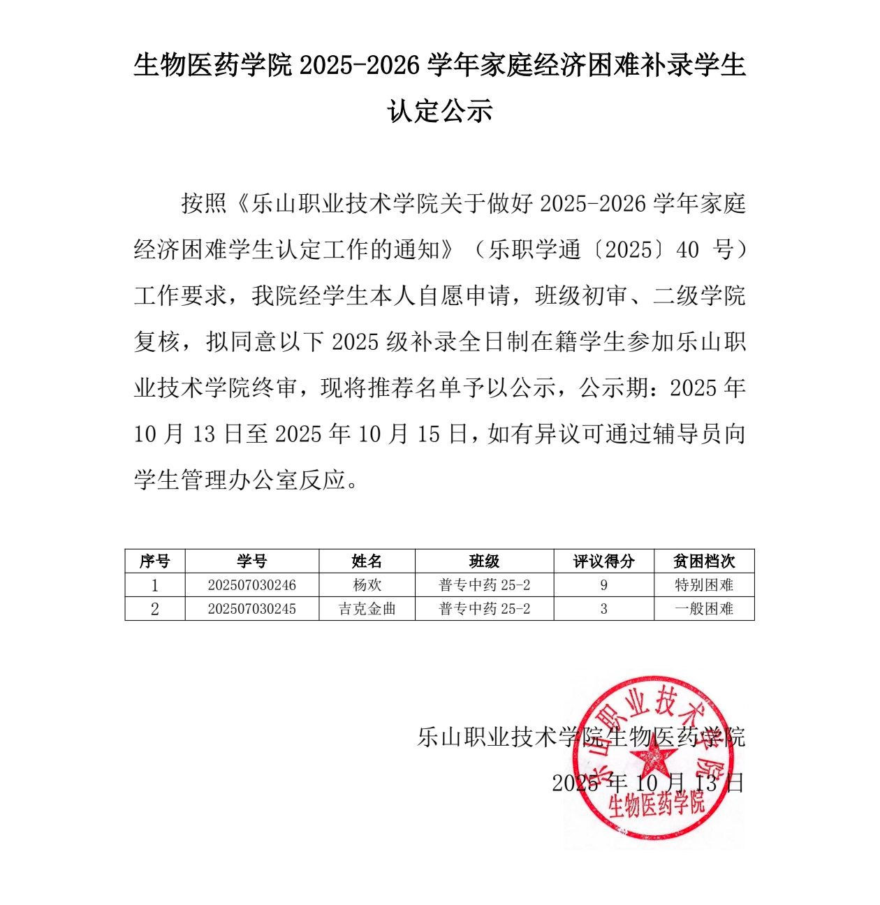 生物医药学院2025-2026学年家庭经济困难补录学生 认定公示