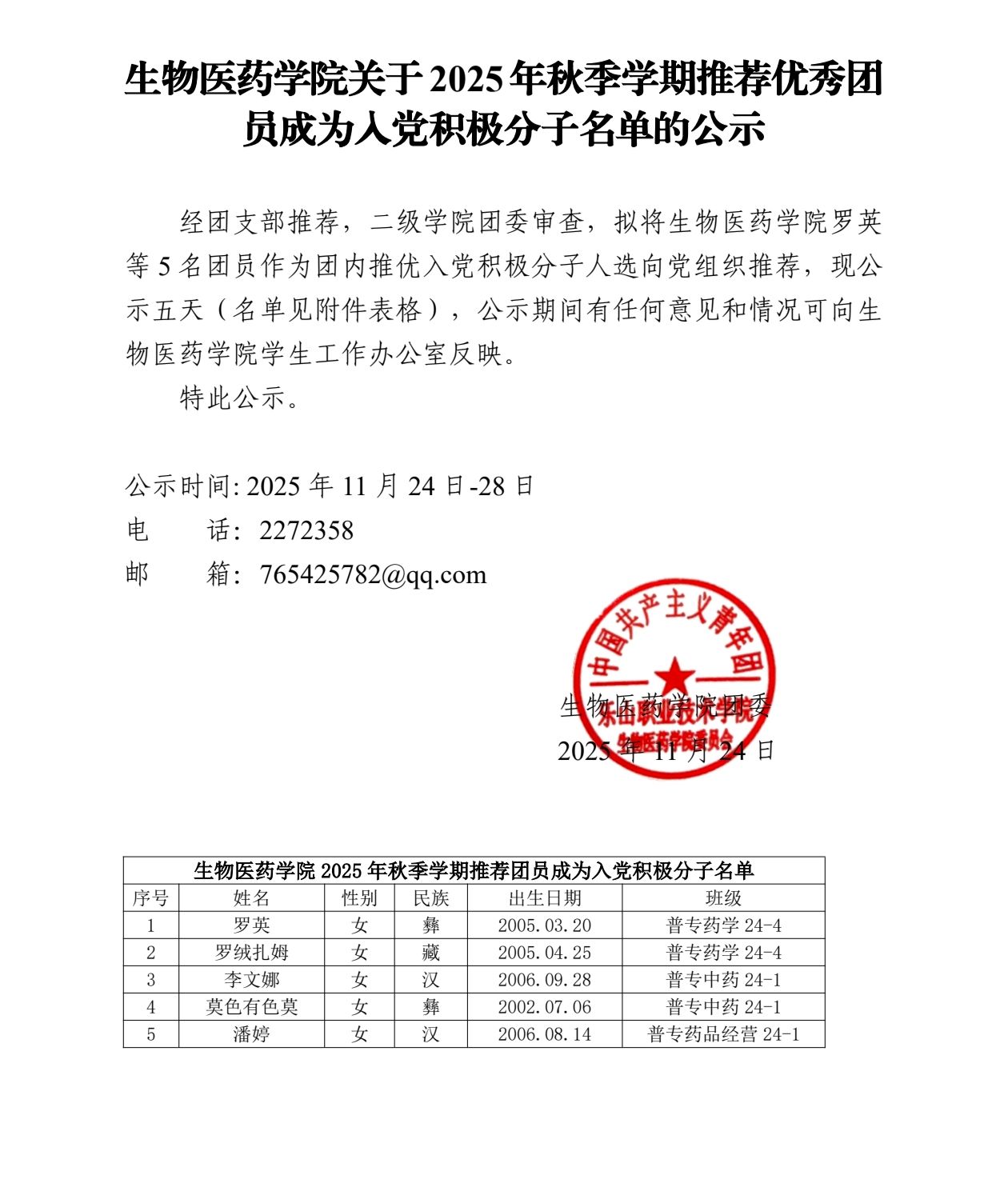 生物医药学院2025年秋季学期 拟推荐群众成为共青团员名单公示