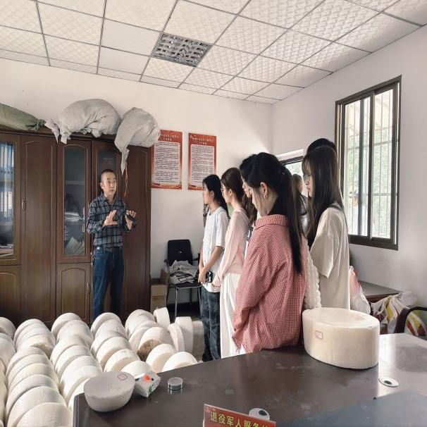 在非遗传承人王荣国老师和晓琴老师的带领下,同学们走进“麻柳白蜡坊”,观摩传承1300年的虫白蜡制作技艺,聆听“峨眉山牌”白蜡远销海外的故事。然后,通过观看虫白蜡“采、剥、熬、滤、凝”的纪录片,视频中,每一个步骤都严谨细致,每一个环节都凝聚着匠人的智慧与心血。同学们被这复杂而精妙的工艺深深吸引,对非遗技艺有了全新的认识。与此同时,王老师还拿出制作过程中使用的实物工具,一一为同学们介绍。面对这些从未见过的工具,同学们纷纷举手提问,王老师则耐心细致地解答。紧接着,王老师将同学们分成四队,带领大家观看成品虫白蜡。同学们不仅用眼睛仔细观察,还亲手触摸第一批次的虫白蜡,在感受中分辨优劣。这一过程,不仅是知识的积累,更是非遗文化的传承。