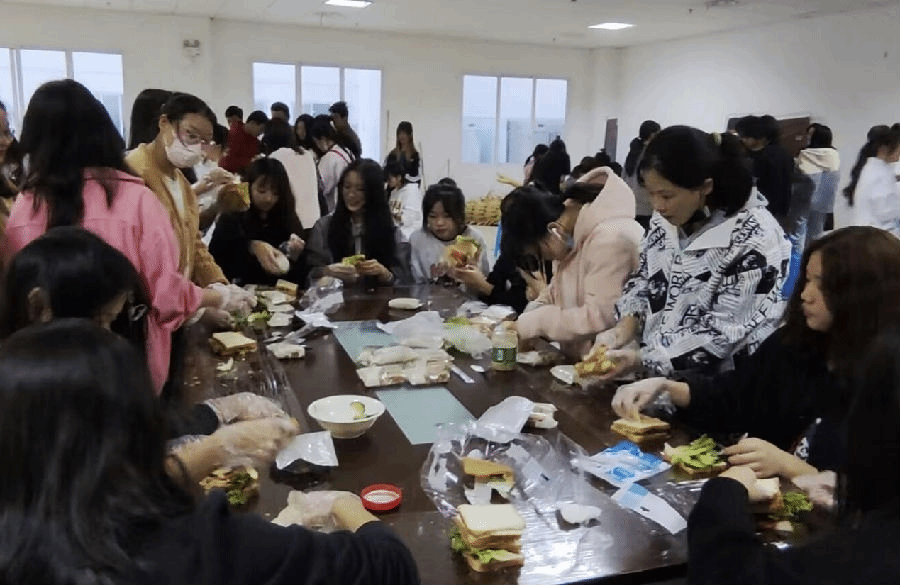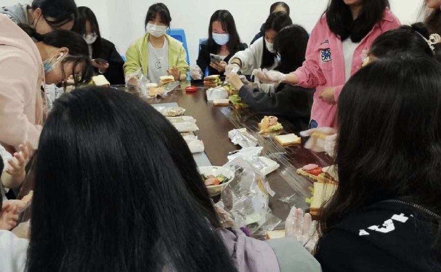 活动开始前,各社团负责人和工作人员提前到达活动现场,准备好相关食材。活动开始时,工作人员向同学们讲解活动注意事项。同学们都自发有序地戴好一次性手套,并拿取自己喜欢食材放入面包片中。做好三明治的同学还互相展示自己的成果,现场一片欢声笑语,气氛非常温馨。