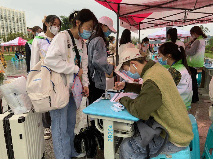 新同学来到陌生环境难免会感到入学报到过程繁琐,为确保整个迎新工作高效有序,药学系团委在接到任务后认真做了充分准备。迎新当天,天空下着雨,伴随着秋风,天气变得有些寒冷,而此时在学院的大门口,药学系志愿者们穿着雨衣,打着雨伞早早守候在“自己的岗位”上维持现场秩序,热情为新同学服务。新同学入校后志愿者们仔细查看每位新生健康码、行程码以及核酸检测报告,为行李消毒,指引方向,发放宿舍卡,搬送行李,引导新生们到社团招新区域再次感受学院各个社团的迎新热情,之后志愿者们把新生们一一安全送到了属于他们的“小天地”。