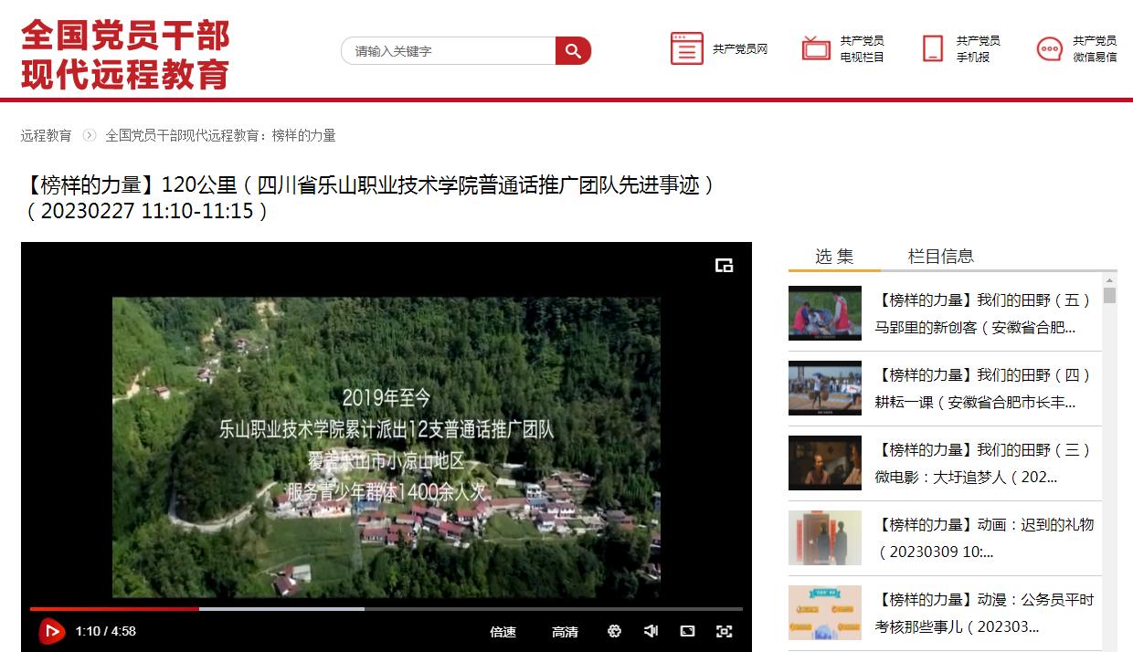 中组部“共产党员网”全国党员干部远程教育榜样的力量专栏,播出了beat365亚洲版官网创作的短视频《120公里》(四川省beat365亚洲版官网普通话推广团队先进事迹)。网址链接为 https://dygbjy.12371.cn/2023/02/25/VIDE1677289442478346.shtml。 2022年11月初,根据市委组织部有关要求,学院组织人事部认真梳理,从学院实际出发,向各级党组织广泛征集关于思政课、文旅课、信息产业课等题材的视频课件,经层层筛选,推荐学工部创作的短视频《...