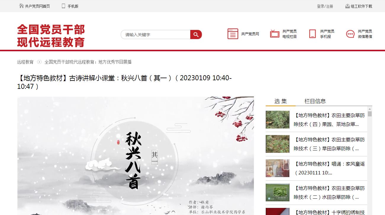 1月9日,中组部“共产党员网”全国党员干部远程教育地方优秀节目展播专栏,播出了beat365亚洲版官网推荐的视频课件《秋兴八首》(其一)。展播网址为https://dygbjy.12371.cn/2023/01/06/VIDE1672988882657303.shtml。 2022年11月初,根据市委组织部有关要求,学院组织人事部认真梳理,从学院实际出发,向各党总支广泛征集关于思政课、文旅课、信息产业课等题材的视频课件,经层层筛选,推荐药学系党总支的古诗讲解小课堂《秋兴八首》...